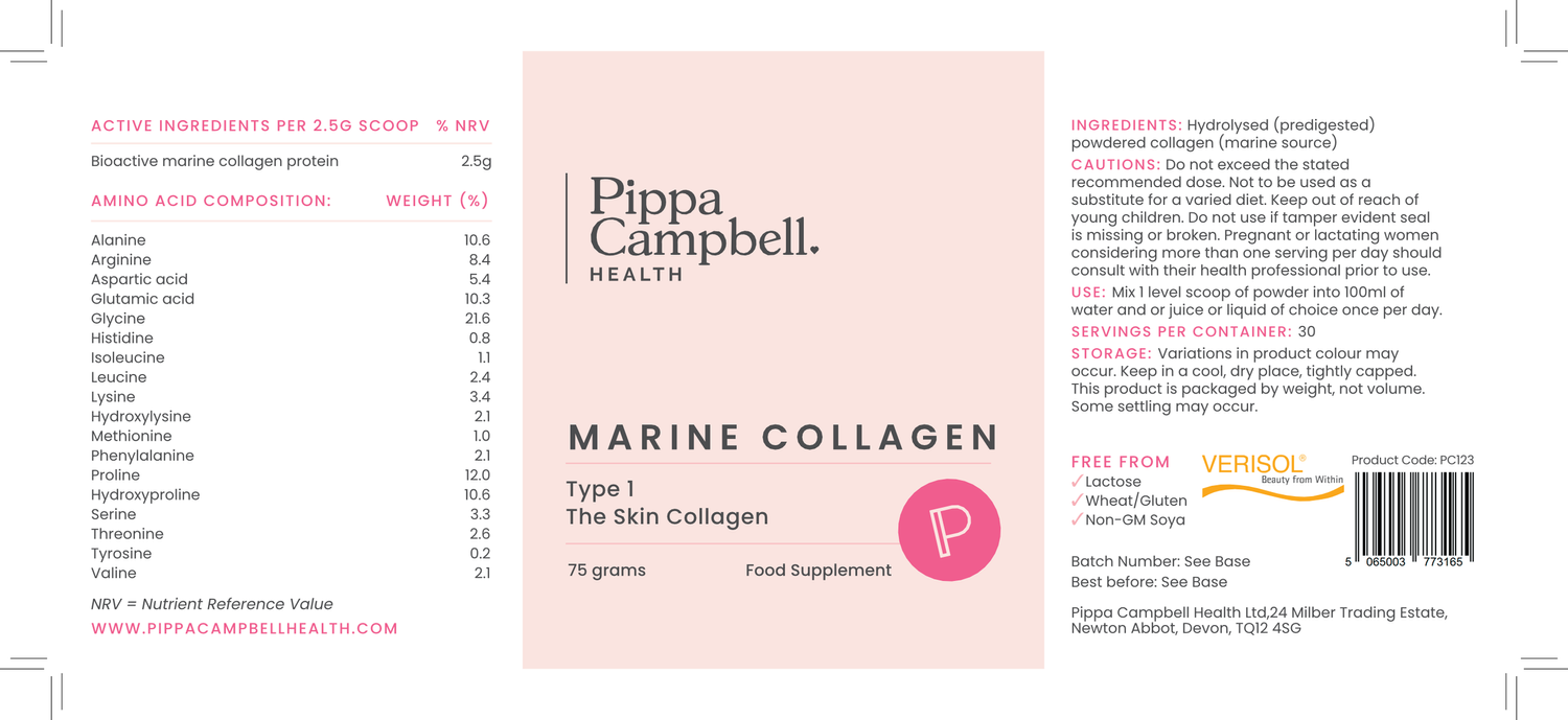 PCH Marine Collagen is a powdered bioactive pre-digested (hydrolysed), well-absorbed Type 1 collagen formula. It has been scientifically proven to stimulate collagen, proteoglycans and elastin synthesis in human fibroblasts which may help counteract the signs of skin ageing and improve visual skin appearance.